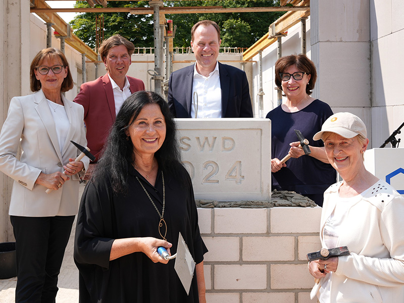 Grundsteinlegung Chemnitzer Straße 1-1b, von links nach rechts: Dr. Eva-Maria Illigen-Günther (Geschäftsführerin SWD), Klaus Feldhaus (Geschäftsführer SWD), Cornelia Zuschke (Beigeordnete der Landeshauptstadt Düsseldorf), Dr. Stephan Keller (Oberbürgermeister der Landeshauptstadt Düsseldorf), Dagmar von Dahlen (Bezirksbürgermeisterin Stadtbezirk 8) und Antonia Frey (Aufsichtsratsvorsitzende SWD)