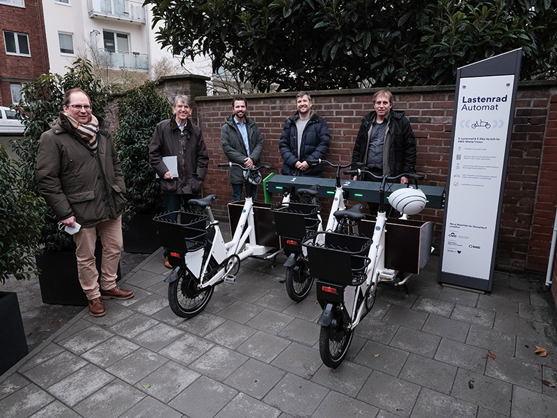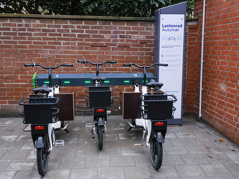 Der Lastenrad-Automat besteht aus einer Stele und einem Bügel mit Ladepunkten für die insgesamt drei E-Lastenräder, zwei für Transporte größerer und eines für kleinere Lasten. Der Automat befindet sich im Innenhof des Quartiers und ist rund um die Uhr, zunächst nur für Mieterinnen und Mieter der SWD, zugänglich.
